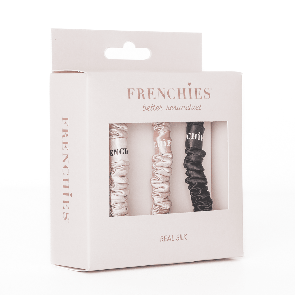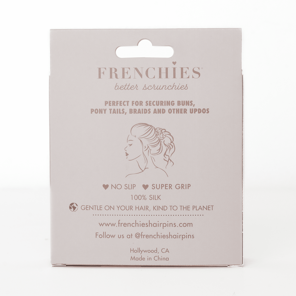 Discover the ultimate hair upgrade with our new Skinny Silk Scrunchie. At Frenchies, we’re all about creating products that actually stay put and keep your hair healthy while doing it. Designed to compete with the biggest names in beauty, our scrunchies are crafted from 100% premium mulberry silk for a level of luxury and hold you won’t find elsewhere.